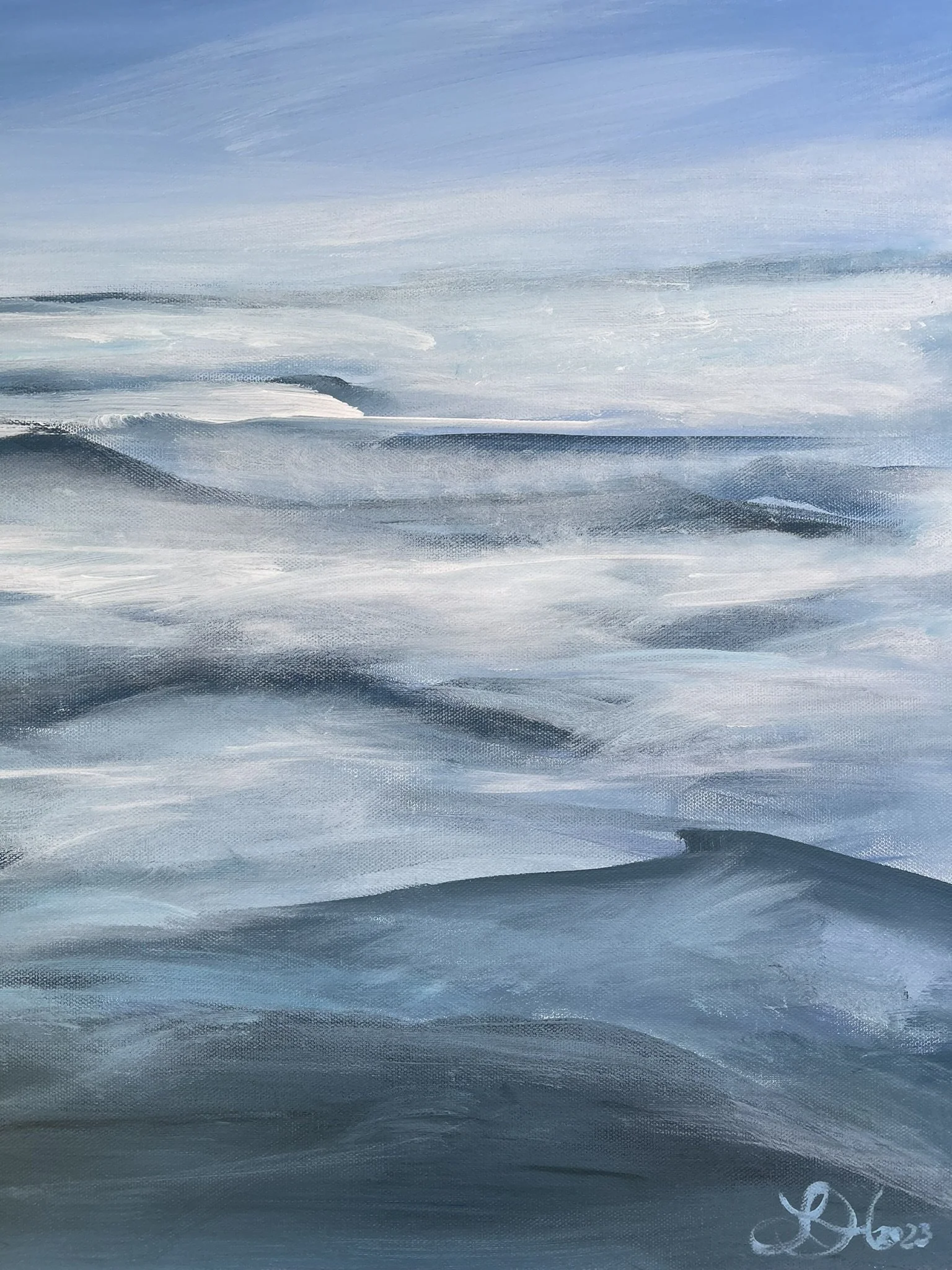 A painting of clouds from above a desert with shades of blue, white, and gray, depicting a calm, serene scene.